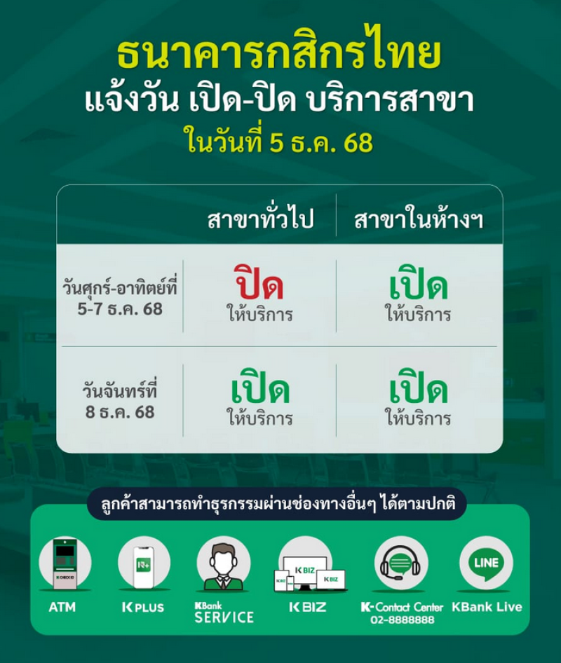 จากกรณี kasikornbank ได้ออกมาประกาศถึงลูกค้าทุกคน เรื่องปิดบริการช่วงวันหยุด เดือนธันวาคม68 โดยวันที่ 5-7 ธันวาคม 68 สาขาทั่วไปปิดให้ใช้บริการชั่วคราว ส่วนสาขาในห้างฯเปิดให้บริการตามปกติ