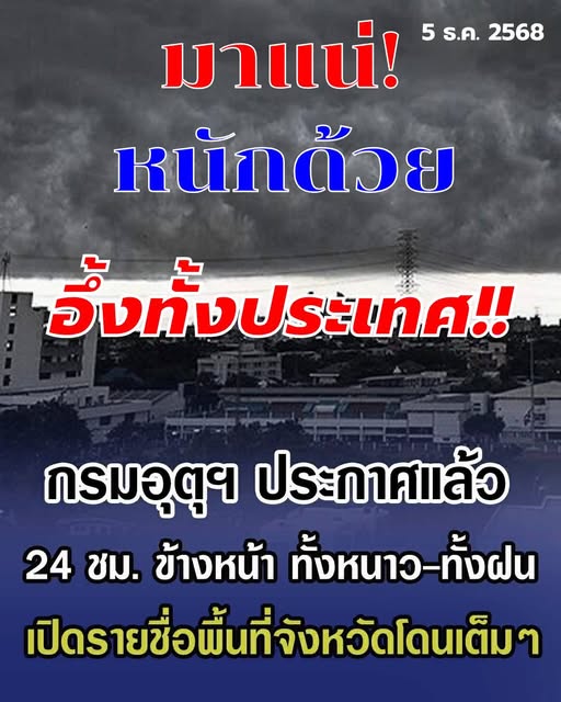 วันที่ 5 ธันวาคม 2568 กรมอุตุนิยมวิทยา พยากรณ์อากาศ 24 ชั่วโมงข้างหน้า ภาคใต้มีฝนเพิ่มขึ้นและมีฝนตกหนักถึงหนักมากบางแห่ง โดยเฉพาะบริเวณจังหวัดนครศรีธรรมราช พัทลุง สงขลา ปัตตานี ยะลา นราธิวาส พังงา ภูเก็ต ตรัง และสตูล ส่วนประเทศไทยตอนบน มีฝน/ฝนฟ้าคะนองเกิดขึ้นได้บางพื้นที่บริเวณภาคตะวันออกเฉียงเหนือตอนล่างและภาคตะวันออก แต่ยังคงมีอากาศเย็นในตอนเช้า ขอให้ประชาชนบริเวณภาคใต้ระวังอันตรายจากฝนตกหนักและฝนที่ตกสะสม ส่วนประชาชนในบริเวณประเทศไทยตอนบนดูแลรักษาสุขภาพจากสภาพอากาศที่เปลี่ยนแปลง และเพิ่มความระมัดระวังในการสัญจรผ่านบริเวณที่มีหมอก