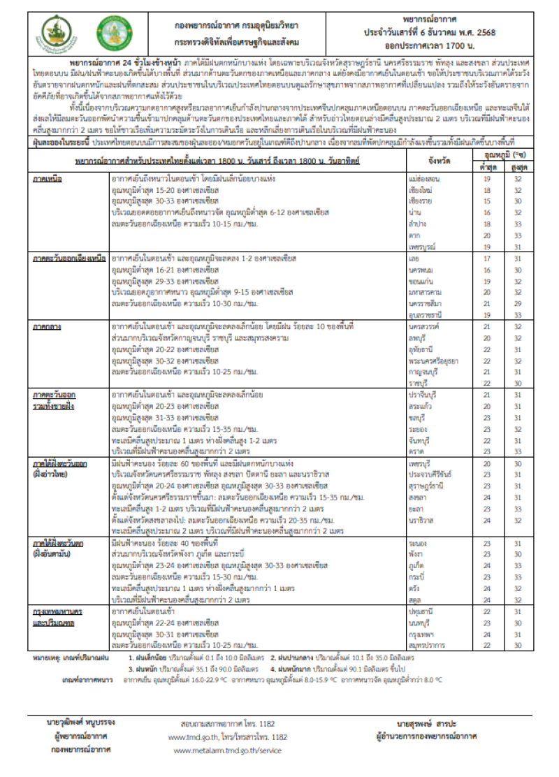 วันที่ 6 ธันวาคม 2568 กรมอุตุนิยมวิทยาได้พยากรณ์อากาศ 24 ชั่วโมงข้างหน้า ภาคใต้มีฝนตกหนักบางแห่ง โดยเฉพาะบริเวณจังหวัดสุราษฎร์ธานี นครศรีธรรมราช พัทลุง และสงขลา ส่วนประเทศไทยตอนบน มีฝน/ฝนฟ้าคะนองเกิดขึ้นได้บางพื้นที่ ส่วนมากด้านตะวันตกของภาคเหนือและภาคกลาง แต่ยังคงมีอากาศเย็นในตอนเช้า