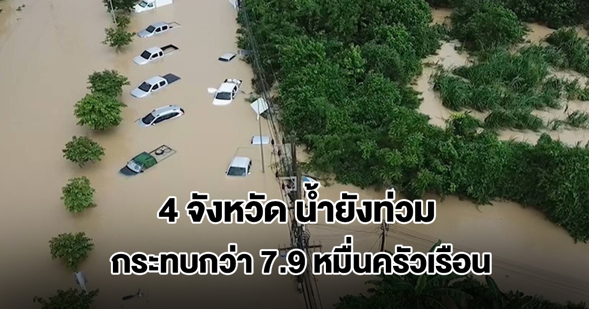 วันที่ 7 ธ.ค. 2568 นายธีรพัฒน์ คัชมาตย์ อธิบดีกรมป้องกันและบรรเทาสาธารณภัย เปิดเผยว่า จากการติดตามสถานการณ์น้ำท่วมในพื้นที่ภาคใต้ ปัจจุบันยังมีสถานการณ์อุทกภัยในพื้นที่ภาคใต้ 4 จังหวัด ได้แก่ สุราษฎร์ธานี นครศรีธรรมราช ตรัง และ สงขลา รวม 17 อำเภอ 92 ตำบล 499 หมู่บ้าน ประชาชนได้รับผลกระทบ 79,662 ครัวเรือน 222,204 คน ดังนี้