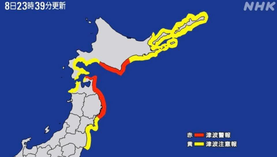 มีประกาศคำเตือนเกี่ยวกับคลื่นสึนามิสำหรับชายฝั่งต่อไปนี้