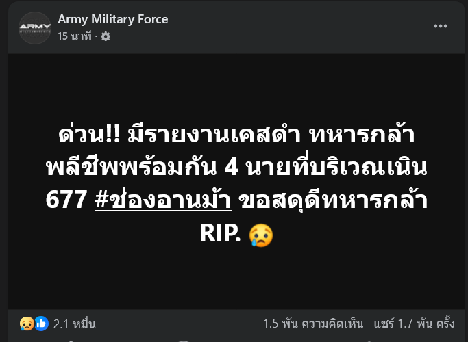 แต่ล่าสุด เพจเฟซบุ๊ก Army Military Force รายงานว่า ด่วน!! มีรายงานเคสดำ ทหารกล้าพลีชีพพร้อมกัน 4 นายที่บริเวณเนิน 677 #ช่องอานม้า ขอสดุดีทหารกล้า RIP.