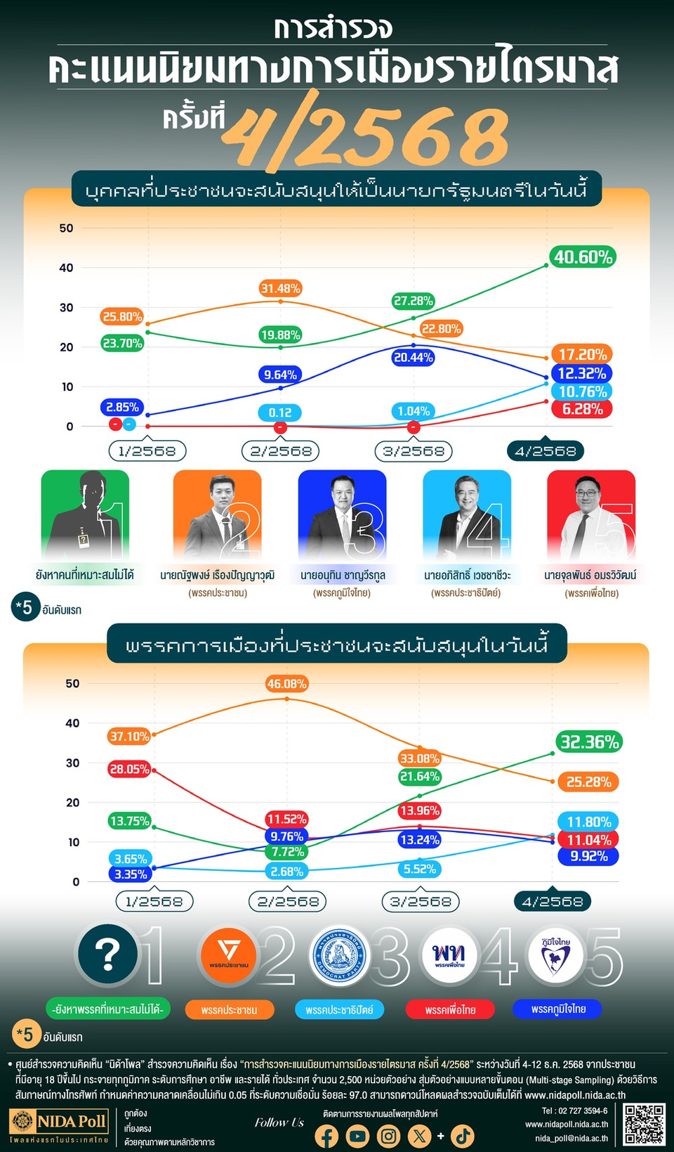 วันที่ 14 ธันวาคม 2568 ศูนย์สำรวจความคิดเห็น สถาบันบัณฑิตพัฒนบริหารศาสตร์ หรือ นิด้าโพล เปิดเผยผลการสำรวจความคิดเห็นประชาชน เรื่อง การสำรวจคะแนนนิยมทางการเมือง รายไตรมาส ครั้งที่ 4/2568 จากการเก็บข้อมูลระหว่างวันที่ 4-12 ธันวาคม 2568 กลุ่มตัวอย่างเป็นประชาชนอายุ 18 ปีขึ้นไป ครอบคลุมทุกภูมิภาค ระดับการศึกษา อาชีพ และรายได้ทั่วประเทศ รวมทั้งสิ้น 2,500 ตัวอย่าง เพื่อสอบถามเกี่ยวกับคะแนนนิยมทางการเมือง