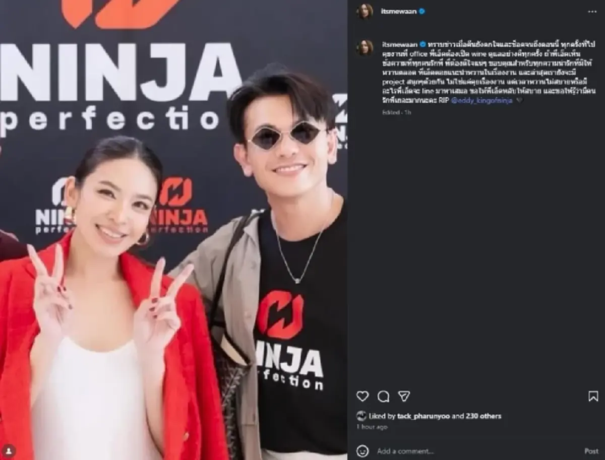 นอกจากนี้ด้าน “น้ำหวาน ซาซ่า” ก็ได้โพสต์ IG @itsmewaan เผยภาพคู่ในอดีตกับเอ็ดดี้ พร้อมข้อความอำลา ระบุว่า “ทราบข่าวเมื่อคืนยังตกใจและช็อคจนถึงตอนนี้ ทุกครั้งที่ไปคุยงานที่ office พี่เอ็ดต้องเปิด wine ดูแลอย่างดีทุกครั้ง ถ้าพี่เอ็ดเห็นข้อความที่ทุกคนรักพี่ พี่ต้องดีใจแน่ๆ ขอบคุณสำหรับทุกความน่ารักที่มีให้หวานตลอด พี่เอ็ดคอยแนะนำหวานในเรื่องงาน และล่าสุดเรายังจะมี project สนุกๆด้วยกัน ไม่ใช่แค่คุยเรื่องงาน แต่เวลาหวานไม่สบายหรือมีอะไรพี่เอ็ดจะ line มาหาเสมอ ขอให้พี่เอ็ดหลับให้สบาย และขอให้รู้ว่ามีคนรักพี่เยอะมากนะคะ RIP”