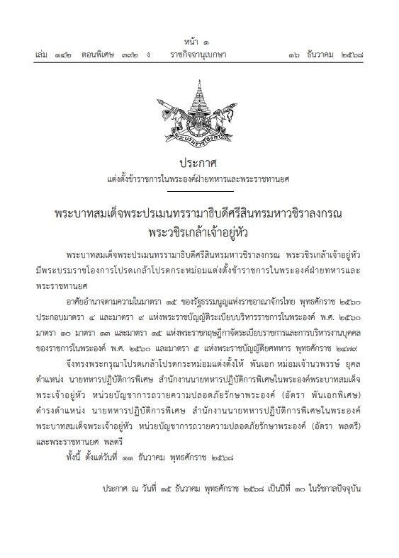 วันที่ 17 ธันวาคม 2568 เว็บไซต์ราชกิจจานุเบกษา ว่า ได้มีการเผยแพร่พระบรมราชโองการประกาศแต่งตั้งข้าราชการในพระองค์ฝ่ายทหารและพระราชทานยศ โดยมีรายละเอียดว่า พระบาทสมเด็จพระปรเมนทรรามาธิบดีศรีสินทรมหาวชิราลงกรณ พระวชิรเกล้าเจ้าอยู่หัว ทรงมีพระบรมราชโองการโปรดเกล้าโปรดกระหม่อม แต่งตั้งข้าราชการในพระองค์ฝ่ายทหารและพระราชทานยศ