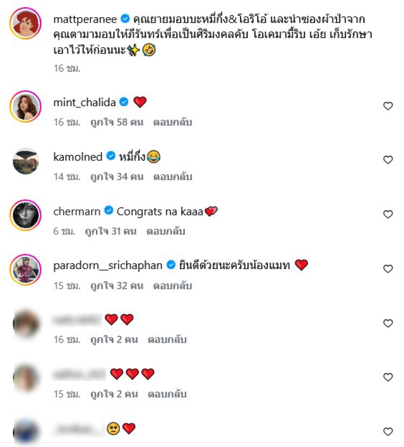 ล่าสุด ทางแมทได้โพสต์ภาพพร้อมคุณยายโดยมีขอมาเซอร์ไพรส์หลานตัวน้อยด้วย และแคปชั้นฮาๆว่า คุณยายมอบบะหมี่กึ่ง&โอริโอ้ และนำซองผ้าป่าจากคุณตามามอบให้ภีรันทร์เพื่อเป็นศิริมงคลคับ โอเคมามี้ริบ เอ้ย เก็บรักษาเอาไว้ให้ก่อนนะ