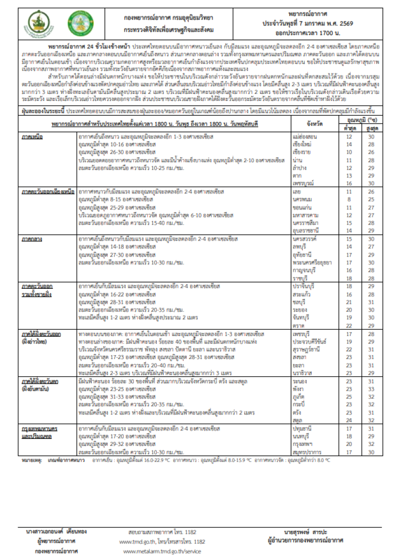 วันที่ 7 มกราคม 2569 ทางกรมอุตุนิยมวิทยาได้พยากรณ์อากาศ 24 ชั่วโมงข้างหน้า ประเทศไทยตอนบนมีอากาศหนาวเย็นลง กับมีลมแรง และอุณหภูมิจะลดลงอีก 2-4 องศาเซลเซียส โดยภาคเหนือ ภาคตะวันออกเฉียงเหนือ และภาคกลางตอนบนมีอากาศเย็นถึงหนาว ส่วนภาคกลางตอนล่าง รวมทั้งกรุงเทพมหานครและปริมณฑล ภาคตะวันออก และภาคใต้ตอนบน