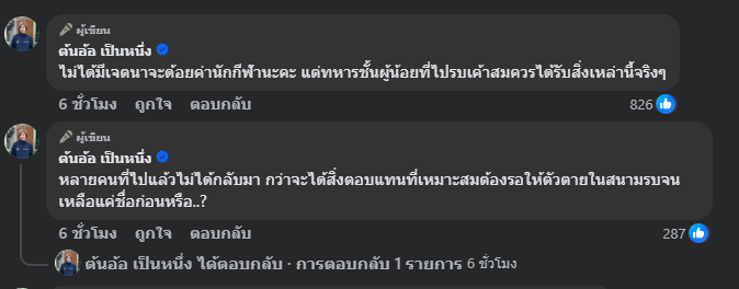 ทหารชั้นผู้น้อยที่ไปรบเขาควรได้รับสิ่งเหล่านี้จริงๆ หลายคนที่ไปแล้วไม่ได้กลับมา กว่าจะได้สิ่งตอบแทนที่เหมาะสม ต้องรอให้ตัวตายในสนามรบจนเหลือแค่ชื่อก่อนหรือ?