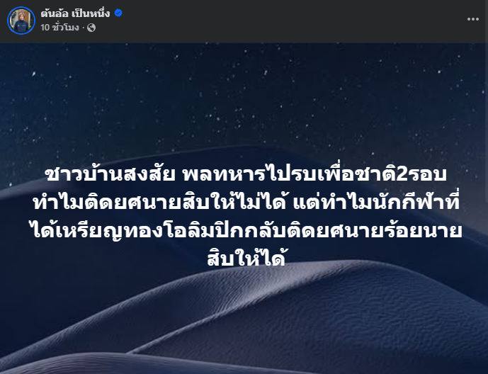 ต่อมา ต้นอ้อ เป็นหนึ่ง ได้เข้ามาชี้แจงเพิ่มเติมในคอมเมนต์ เพื่อป้องกันความเข้าใจผิด โดยยืนยันว่าไม่ได้มีเจตนาลดทอนคุณค่าหรือความสำเร็จของนักกีฬาทีมชาติแต่อย่างใด แต่ต้องการสะท้อนปัญหาและเรียกร้องสวัสดิการ รวมถึงความก้าวหน้าในอาชีพให้กับทหารชั้นผู้น้อยที่ปฏิบัติหน้าที่ในพื้นที่เสี่ยงภัย