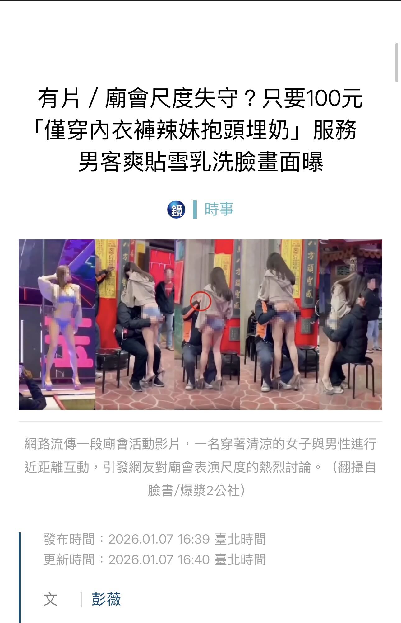 แม้จะยังไม่มีการระบุชัดเจนว่างานนี้จัดขึ้นที่วัดไหน แต่กรณีนี้ได้จุดประเด็นถกเถียงในสังคมไต้หวันอีกครั้งว่า ขอบเขตของความบันเทิงในงานประเพณีควรอยู่ตรงไหน? การใช้นางแบบวาบหวิวเพื่อดึงดูดคนเข้างาน เป็นเรื่องที่ยอมรับได้จริงหรือ? หรือนี่เป็นเพียงกลยุทธ์เรียกแขกที่ล้ำเส้นศีลธรรมไปแล้วกันแน่