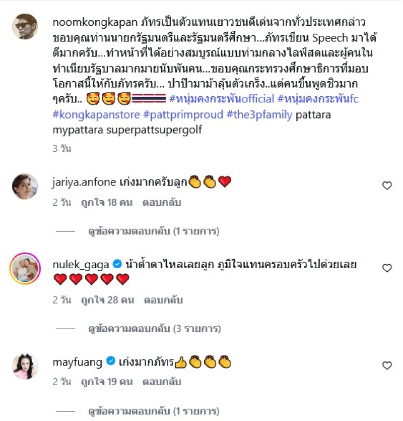 ด้าน หนุ่ม คงกระพัน ได้โพสต์ถึงลูกชายว่า ภัทรเป็นตัวแทนเยาวชนดีเด่นจากทั่วประเทศกล่าวขอบคุณท่านนายกรัฐมนตรีและรัฐมนตรีศึกษา…ภัทรเขียน Speech มาได้ดีมากครับ…ทำหน้าที่ได้อย่างสมบูรณ์แบบท่ามกลางไลฟ์สดและผู้คนในทำเนียบรัฐบาลมากมายนับพันคน…ขอบคุณกระทรวงศึกษาธิการที่มอบโอกาสนี้ให้กับภัทรครับ… ปาป๊ามาม้าลุ้นตัวเกร็ง..แต่คนขึ้นพูดชิวมากๆครับ.. #หนุ่มคงกระพันofficial #หนุ่มคงกระพันfc #kongkapanstore #pattprimproud #the3pfamily pattara mypattara superpattsupergolf