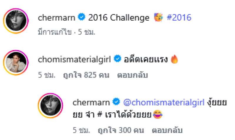พร้อมแคปชั่นว่า 2016 Challenge #2016 โดยมีเพื่อนในวงการต่างต่างเข้ามาคอมเมนต์กันสนั่น รวมถึง ชมพู่ อารยา ได้เข้ามาคอมเมนต์แซวว่า อดีตเคยเเรง