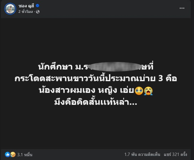 วันที่ 17 มกราคม 2569 มีรายงานว่า เฟซบุ๊ก ซอง ดูฮี อินฟลูชื่อดัง ได้โพสต์ข่าวช็อกระบุว่า นักศึกษา ม.ดังที่กระโดดสะพานขาววันนี้ประมาณบ่าย 3 คือน้องสาวผมเอง หญิง เอ่ย มึงคือคิดสั้นเเท้หล่า