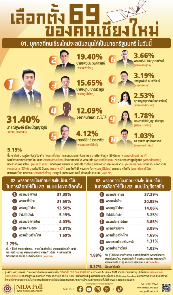 วันที่ 18 มกราคม 2569 ศูนย์สำรวจความคิดเห็น นิด้าโพล สถาบันบัณฑิตพัฒนบริหารศาสตร์ (นิด้า) เปิดเผยผลการสำรวจความคิดเห็นประชาชน เรื่อง เลือกตั้ง 69 ของคนเชียงใหม่ โดยดำเนินการสำรวจระหว่างวันที่ 9-14 มกราคม 2569 จากประชาชนอายุ 18 ปีขึ้นไป ที่มีสิทธิเลือกตั้งในจังหวัดเชียงใหม่ ครอบคลุมทุกระดับการศึกษา อาชีพ และรายได้ รวมจำนวน 1,067 ตัวอย่าง