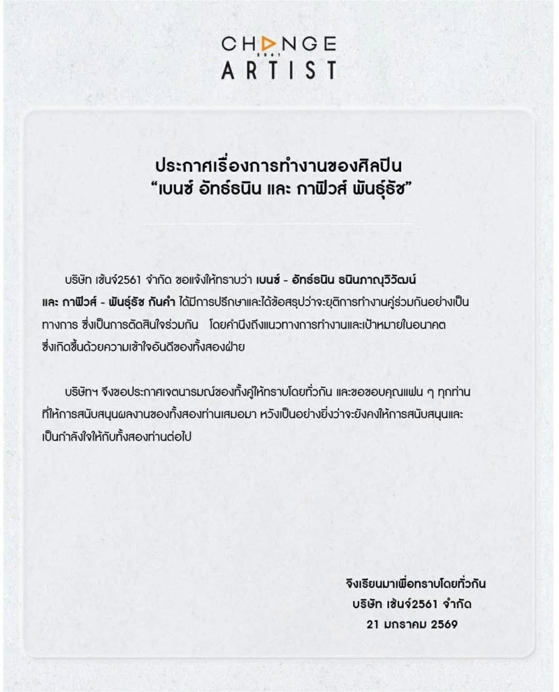 หนึ่งในคู่ที่ประกาศยุติการทำงานร่วมกัน คือ เบนซ์ อัทธ์ธนิน และ กาฟิวส์ พันธุ์ธัช ซึ่งทั้งสองฝ่ายเห็นพ้องต้องกันว่า ถึงเวลาเหมาะสมในการโฟกัสงานในรูปแบบใหม่ของตนเอง