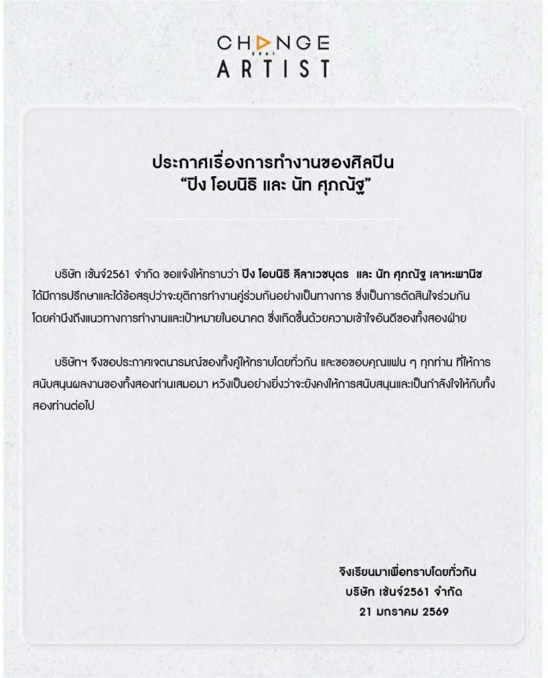 ขณะเดียวกัน ปิง โอบนิธิ และ นัท ศุภณัฐ ก็ได้ข้อสรุปในทิศทางเดียวกัน เป็นการแยกย้ายในเชิงงานอย่างเป็นมิตร ไม่มีประเด็นความขัดแย้งใดๆ