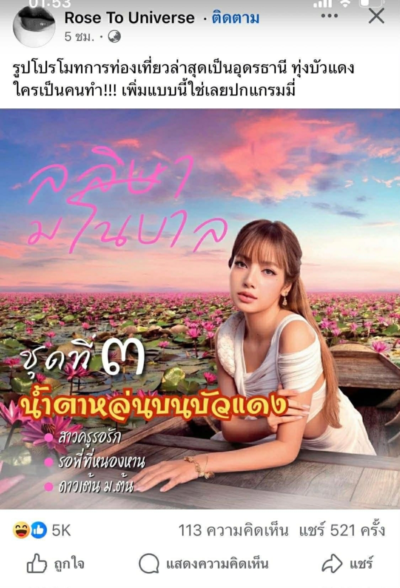 เรียกได้ว่า โซเชียลลุกเป็นไฟทันที หลังภาพโปรโมตการท่องเที่ยวของ ลิซ่า BLACKPINK ในบทบาท Tourism Ambassador ถูกเผยแพร่ออกมา โดยเป็นภาพขณะนั่งเรือชมทะเลบัวแดง จังหวัดอุดรธานี ซึ่งกลับสร้างเสียงวิจารณ์มากกว่าคำชื่นชม