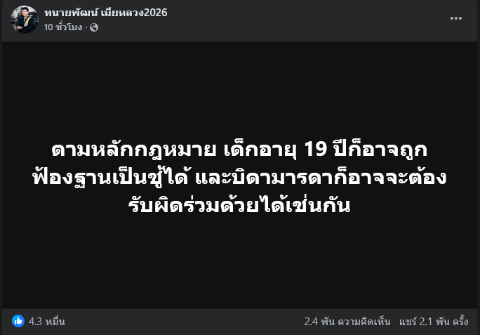 กลายเป็นประเด็นร้อนที่ชาวโซเชียลอย่างเราๆถึงกับต้องร้องอุ้ย! เมื่อทนายพัฒน์ เจ้าของฉายา ทนายเมียหลวง 2026 ได้ออกมาโพสต์ข้อความผ่านเฟซบุ๊กส่วนตัว เตือนสติสายแซ่บวัยใส ระบุว่า ตามหลักกฎหมาย เด็กอายุ 19 ปีก็อาจถูกฟ้องฐานเป็นชู้ได้ และบิดามารดาก็อาจจะต้องรับผิดร่วมด้วยได้เช่นกัน