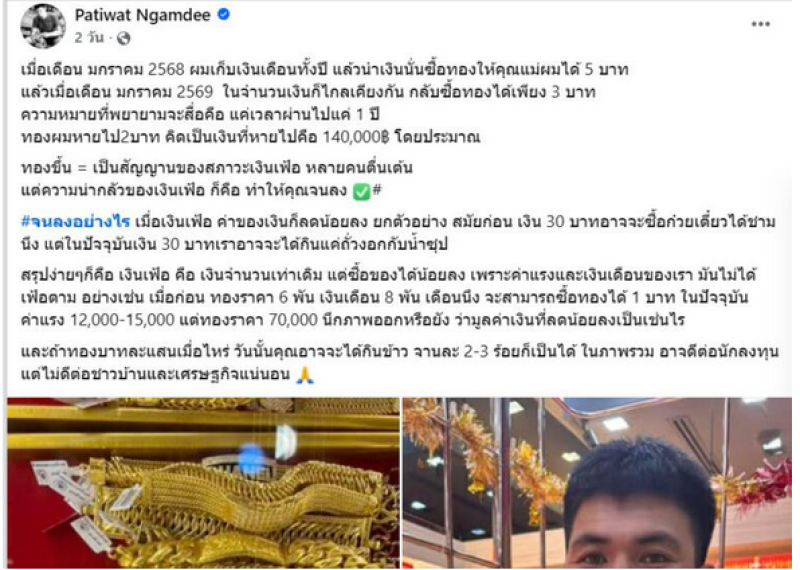 แล้วเมื่อเดือน มกราคม 2569 ในจำนวนเงินก็ไกลเคียงกัน กลับซื้อทองได้เพียง 3 บาท ความหมายที่พยายามจะสื่อคือ แค่เวลาผ่านไปแค่ 1 ปี ทองผมหายไป 2 บาท คิดเป็นเงินที่หายไปคือ 140,000฿ โดยประมาณ ทองขึ้น = เป็นสัญญานของสภาวะเงินเฟ้อ หลายคนตื่นเต้น แต่ความน่ากลัวของเงินเฟ้อ ก็คือ ทำให้คุณจนลง
