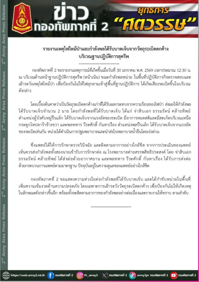 วันที่ 30 มกราคม 2569 ศูนย์ประชาสัมพันธ์กองทัภาคที่ 2 รายงานเหตุไฟไหม้ป่าและกำลังพลได้รับบาดเจ็บจากวัตถุระเบิดตกค้าง บริเวณฐานปฏิบัติการสุครีพ ผ่านเพจเฟซบุ๊ก กองทัพภาคที่ 2 โดยระบุว่า กองทัพภาคที่ 2 ขอรายงานเหตุการณ์ที่เกิดขึ้นเมื่อวันที่ 30 มกราคม พ.ศ. 2569 เวลาประมาณ 12.30 น. ณ บริเวณด้านหน้าฐานปฏิบัติการสุครีพ (หน้าเนิน) ขณะกำลังพลหน่วย ในพื้นที่ปฏิบัติภารกิจตรวจสอบและ เฝ้าระวังเหตุไฟไหม้ป่า เพื่อป้องกันไม่ให้ไฟลุกลามเข้าสู่พื้นที่ฐานปฏิบัติการ ได้เกิดเสียงระเบิดขึ้นในบริเวณดังกล่าว