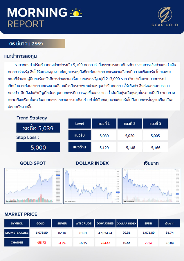 เเนะนำการลงทุนด้านทองคำ รอบเช้าวันนี้ 6 มีนาคม 2569 โดย บริษัท จีแคป จำกัด ราคาทองคำปรับตัวลดลงต่ำกว่าระดับ 5,100 ดอลลลาร์ เนื่องจากแรงกดดันหลักมาจากการแข็งค่าของค่าเงิน ดอลลาร์สหรัฐ ซึ่งได้รับแรงหนุนจากข้อมูลเศรษฐกิจที่สะท้อนว่าตลาดแรงงงานยังคงมีความแข็งแกร่ง โดยเฉพาะขณะที่จำนวนผู้ยื่นขอรับสวัสดิการว่างงานครั้งแรกของสหรัฐอยู่ที่ 213,000 ราย ต่ำกว่าที่ตลาดคาดการณ์เล็กน้อย สะท้อนว่าตลาดแรงงานยังคงมีเสถียรภาพและช่วยหนุนค่าเงินดลลาร์ให้แข็งค่า ซึ่งส่งผลลบต่อราคาทองคำ