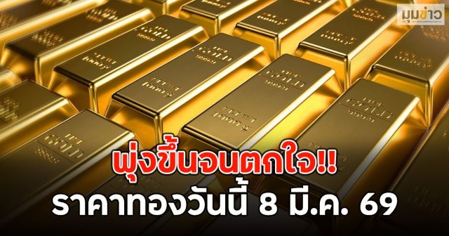 ราคาทองวันนี้ ประจำวันอาทิตย์ ที่ 8 มีนาคม 2569 ราคาทองตามประกาศสมาคมค้าทองคำ ซึ่งปิดตลาดทองคำ ประจำวันเสาร์ที่ 7 มีนาคม 2569 ประกาศครั้งเดียว เมื่อเวลา 09.31 น. พุ่งขึ้นพรวดเดียว 1,100 บาท สู่บริเวณ 77,800 บาท