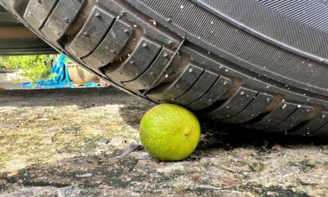 วางผลมะนาวไว้บริเวณใต้ล้อรถทั้ง 4 จากนั้นขับรถทับให้มะนาวแตก