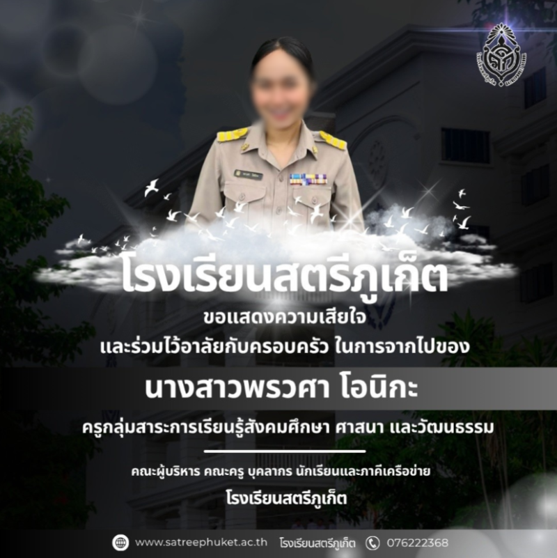 ล่าสุด โรงเรียนสตรีภูเก็ต ได้ออกมาแสดงความอาลัยต่อการจากไปของครูสาว วัย 25 ปี โดยระบุว่า