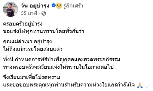 เกิดข่าวเศร้าในแวดวงการเมืองไทย เมื่อ “วัน อยู่บำรุง” ออกมาโพสต์แจ้งการสูญเสียครั้งสำคัญของครอบครัว หลัง “ลำเนา อยู่บำรุง” มารดา ได้จากไปอย่างสงบ ท่ามกลางความอาลัยของคนใกล้ชิดและผู้ที่รู้จัก
