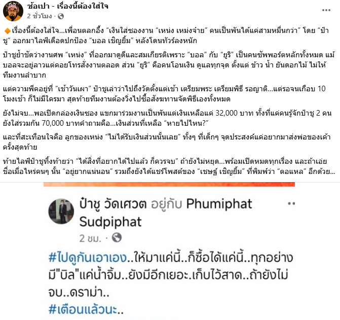 โดยระบุว่า เพื่อนตลกเกิดความสงสัยเกี่ยวกับเงินใส่ซองในงานของ เหน่ง เหม่งจ๋าย ซึ่งมีแขกมาร่วมงานเป็นจำนวนมาก แต่ยอดเงินที่ได้กลับมีเพียงสามหมื่นกว่าบาท ขณะเดียวกัน ป๋าชู ได้ออกมาไลฟ์สดแสดงความไม่พอใจ พร้อมปกป้อง บอล เชิญยิ้ม หลังถูกกระแสโจมตีอย่างหนัก