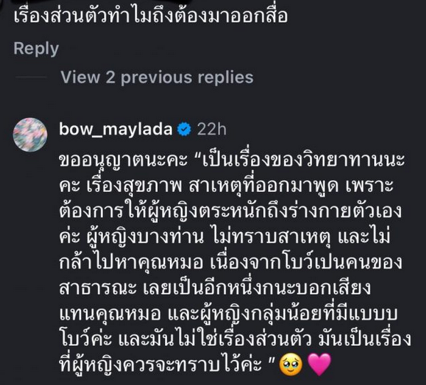 ล่าสุด โบว์ ได้ออกมาตอบกลับว่า ขออนุญาตนะคะ เป็นเรื่องของวิทยาทานนะคะ เรื่องสุขภาพ สาเหตุที่ออกมาพูด เพราะต้องการให้ผู้หญิงตระหนักถึงร่างกายตัวเองค่ะ ผู้หญิงบางท่าน ไม่ทราบสาเหตุ
