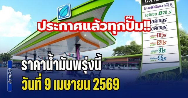หลังคณะกรรมการบริหารกองทุนน้ำมันเชื้อเพลิง (กบน.) มีมติเห็นชอบให้ปรับลดราคาหน้าโรงกลั่นสำหรับน้ำมันดีเซล B7 และ B20 ลง 2 บาทต่อลิตร ซึ่งถือเป็นการปรับลดลงครั้งแรกในประวัติศาสตร์ โดยใช้สูตรอ้างอิงราคาตลาดกลางสิงคโปร์รูปแบบใหม่ ส่งผลให้ราคาขายปลีก ณ สถานีบริการน้ำมันปรับลดลง 2.14 บาทต่อลิตร ส่งผลให้ราคาขายปลีกหน้าปั๊ม น้ำมันดีเซล B7 อยู่ที่ 48.40 บาทต่อลิตร น้ำมันดีเซล B20 อยู่ที่ 43.40 บาทต่อลิตร มีผลตั้งแต่วันที่ 9 เมษายน 2569 เป็นต้นไป ส่งผลให้ราคาน้ำมันพรุ่งนี้ 9 เมษายน มีดังนี้