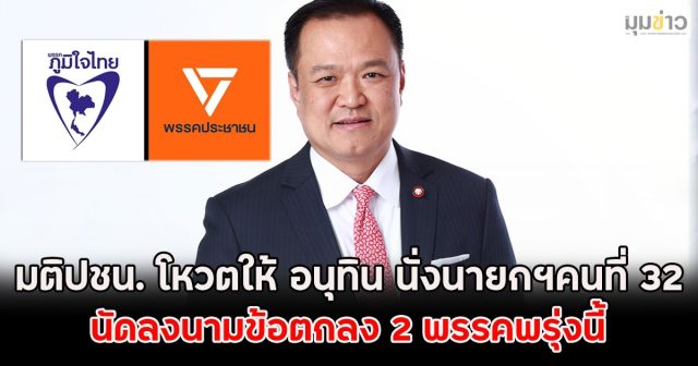 ด่วน!! มติปชน. โหวตให้ อนุทิน นั่งนายกฯคนที่ 32 นัดลงนามข้อตกลง 2 พรรคพรุ่งนี้