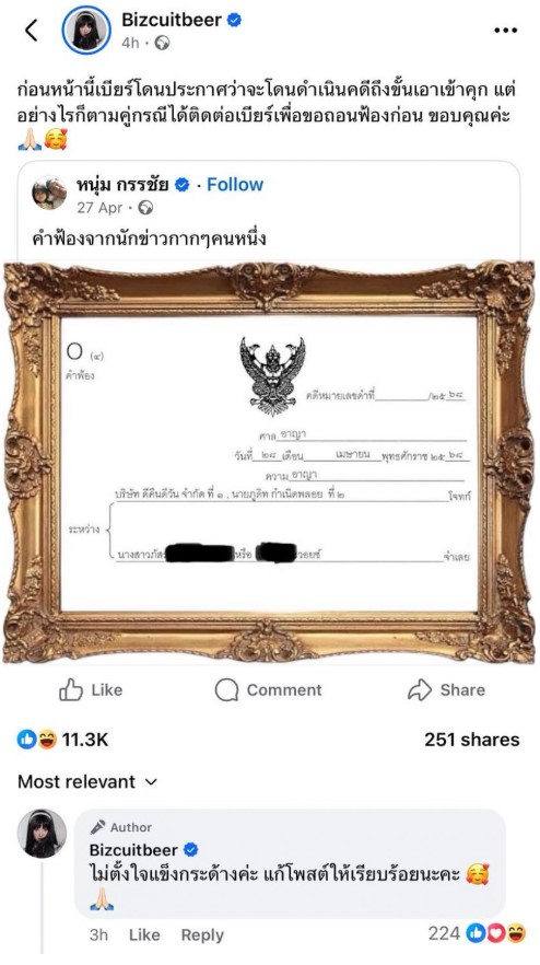 ก่อนหน้านี้ เบียร์ เดอะวอยซ์ ได้โพสต์ข้อความบนโซเชียลมีเดียในลักษณะที่ว่าคู่กรณีได้ติดต่อมาถอนฟ้อง ทำให้หลายคนสงสัยถึงเบื้องหลังเรื่องราวที่เกิดขึ้น