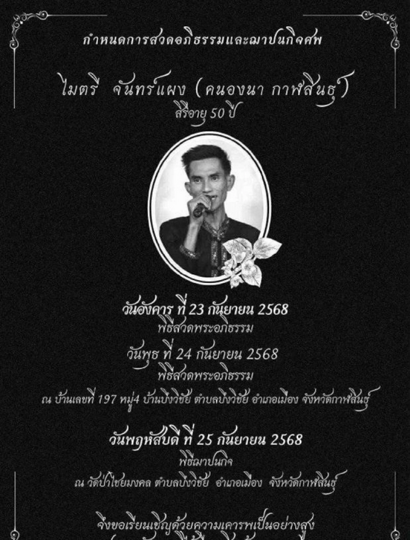 เรียกได้ว่าเป็นอีกหนึ่งข่าวเศร้า หลัง เพจ อัพเดทข่าวอุดร – UD News Update รายงานการจากไปของ คนองนา กาฬสินธุ์ อดีตพระเอกหมอลำชื่อดัง เจ้าของบทเพลงอมตะ จดหมายสามซอง หลังล้มป่วยมาระยะหนึ่งก่อนจากไปอย่างสงบ