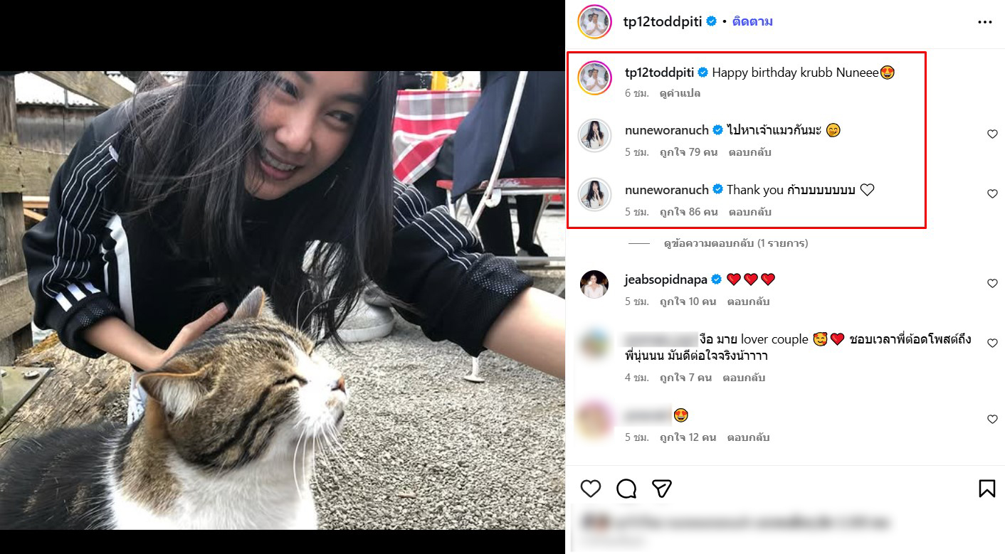 จากนั้น นุ่น ก็เข้ามาคอมเมนต์ใต้โพสต์ว่า “ไปหาเจ้าแมวกันมะ 🤭Thank you ก้าบบบบบบบ 🤍”