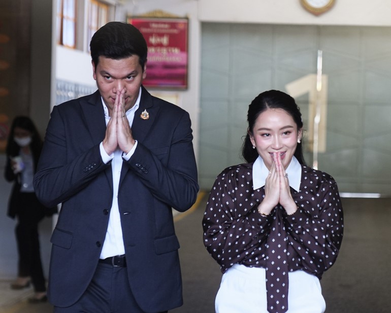 โดยมีมวลชนคนเสื้อแดงถือร่มสีแดง สกรีนภาพการ์ตูนรูปนายทักษิณ ชินวัตร กล่าวทักทาย ซึ่ง น.ส.แพทองธาร และนายปิฎก
