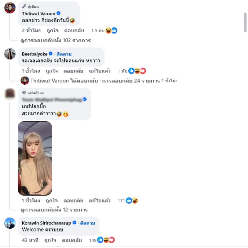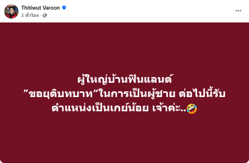 ระบุว่า ผู้ใหญ่บ้านฟินแลนด์ ขอยุติบทบาท ในการเป็นผู้ชาย ต่อไปนี้รับตำแหน่งเป็นเกย์น้อย เจ้าค่ะ โดยมีบุ้ง ใบหยก ได้เข้ามาคอมเมนต์ว่า รอเจอเลยครับ จะไปขอนแก่น หยาาา และเเท็ค ภรัณยู ได้คอมเมนต์ว่า น่ารักพร้อมอิโมจิหัวใจ และคนอื่นๆอีกมากมาย