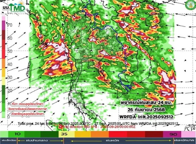 สภาพอากาศวันนี้ วันที่ 26 ก.ย. 2568 กรมอุตุนิยมวิทยา พยากรณ์อากาศ 24 ชั่วโมงข้างหน้า ระบุว่า ประเทศไทยมีฝนเพิ่มขึ้น และมีฝนตกหนักถึงหนักมากบางแห่งในบริเวณภาคเหนือ ภาคตะวันออกเฉียงเหนือ และภาคตะวันออก โดยเฉพาะบริเวณจังหวัดพิษณุโลก เพชรบูรณ์ เลย ชัยภูมิ ขอนแก่น นครราชสีมา บุรีรัมย์ จันทบุรี และตราด ส่วนภาคกลางรวมทั้งกรุงเทพมหานครและปริมณฑล มีฝนตกหนักบางพื้นที่