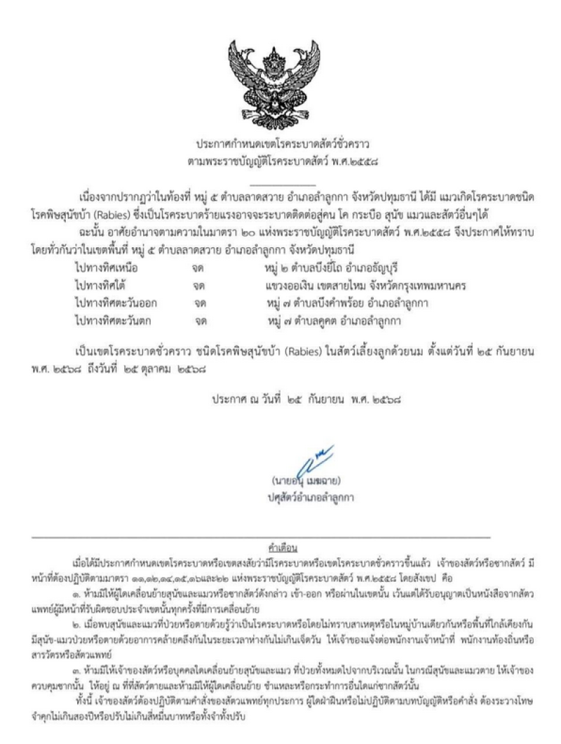 ในเขตพื้นที่ หมู่ 5 ต.ลาดสวาย อ.ลำลูกกา จ.ปทุมธานี ไปทางทิศเหนือ หมู่ 2 ต.บึงยี่โถ อ.ธัญบุรี ไปทางทิศใต้ แขวงออเงิน เขตสายไหม กรุงเทพมหานคร ไปทางทิศตะวันออก หมู่ 7 ต.บึงคำพร้อย อ.ลำลูกกา ไปทางทิศตะวันตก หมู่ 7 ต.คูคต อ.ลำลูกกา เป็นเขตโรคระบาดชั่วคราว ชนิดโรคพิษสุนัขบ้า (Rabies) ในสัตว์เลี้ยงลูกด้วยนม ตั้งแต่วันที่ 25 ก.ย.-25 ต.ค.68