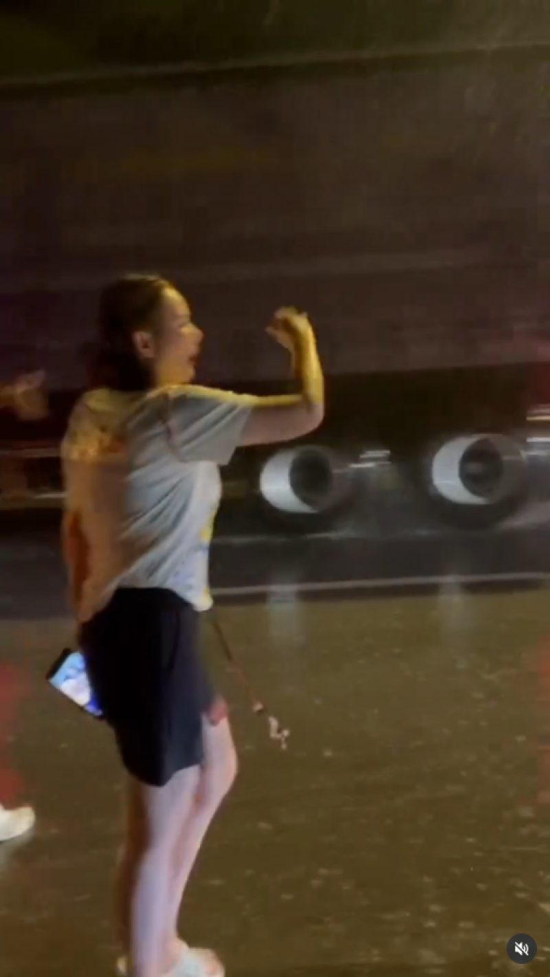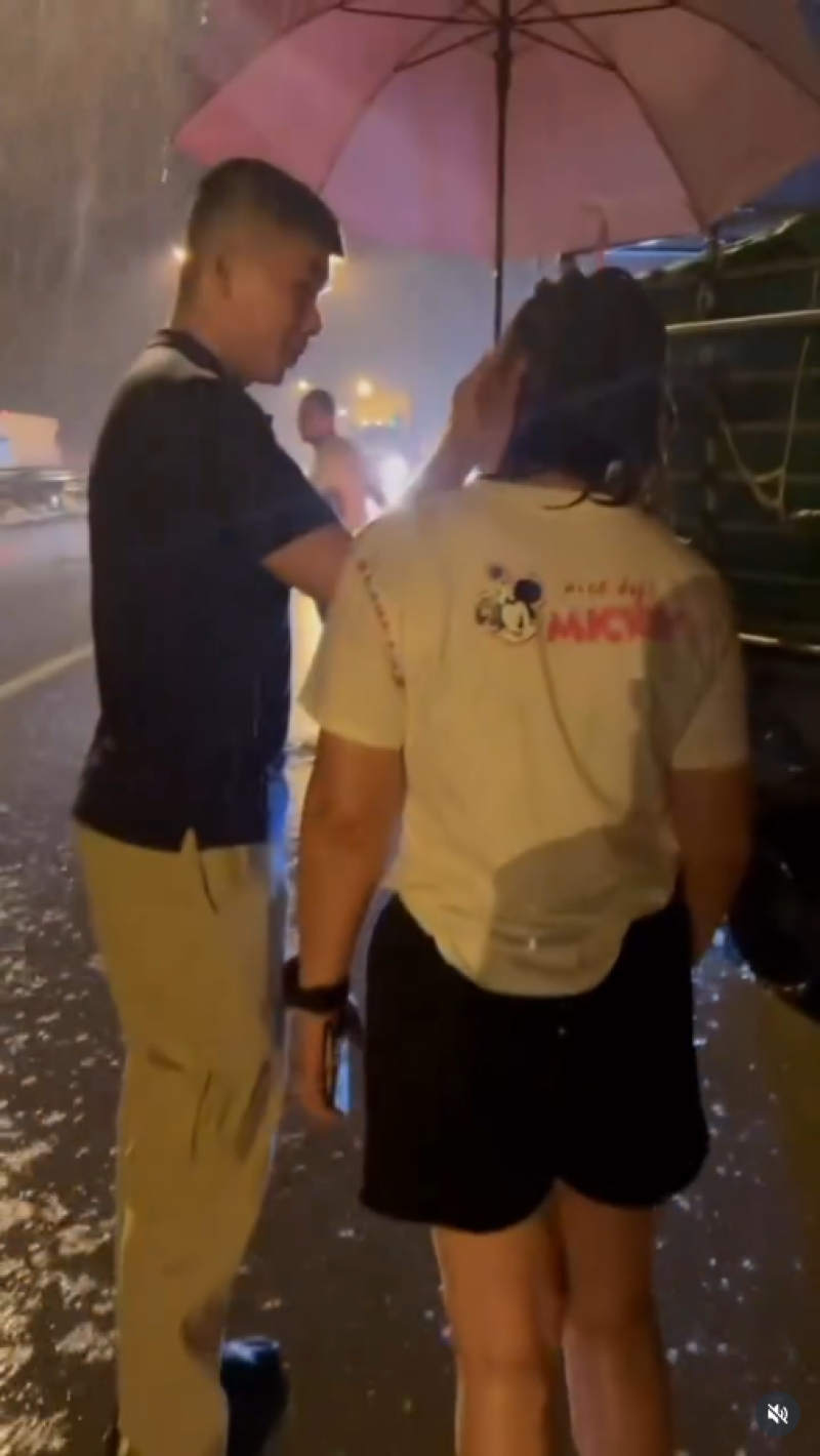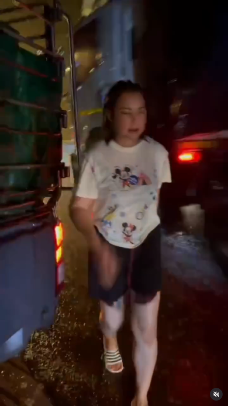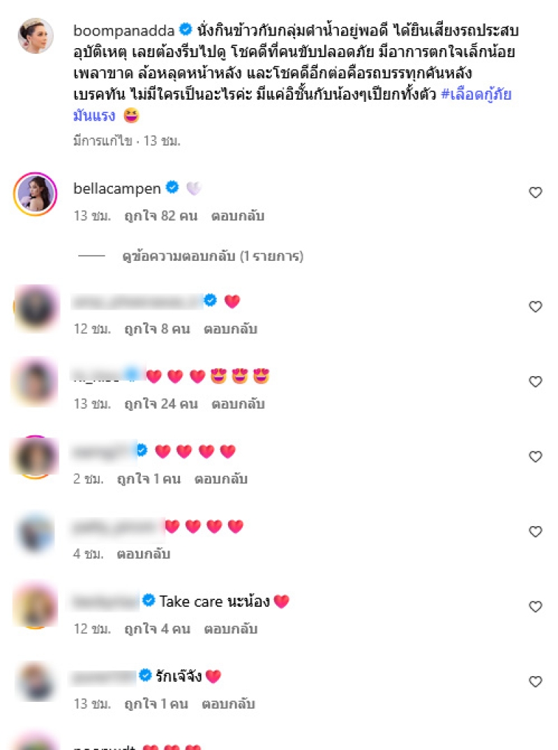 พร้อมเขียนเล่าเหตุการณ์ว่า นั่งกินข้าวกับกลุ่มดำน้ำอยู่พอดี ได้ยินเสียงรถประสบอุบัติเหตุ เลยต้องรีบไปดู โชคดีที่คนขับปลอดภัย มีอาการตกใจเล็กน้อย เพลาขาด ล้อหลุดหน้าหลัง และโชคดีอีกต่อคือรถบรรทุกคันหลังเบรคทัน ไม่มีใครเป็นอะไรค่ะ มีแค่อิชั้นกับน้องๆเปียกทั้งตัว #เลือดกู้ภัยมันแรง