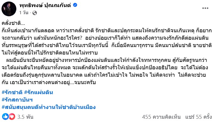ขายชาติ ไม่ให้สู้ตอนนี้ให้ไปรักชาติตอนไหนไม่ทราบ ผมยืนยันจะยืนหยัดอยู่ข้างทหารปกป้องแผ่นดินและให้กำลังใจทหารทุกคน