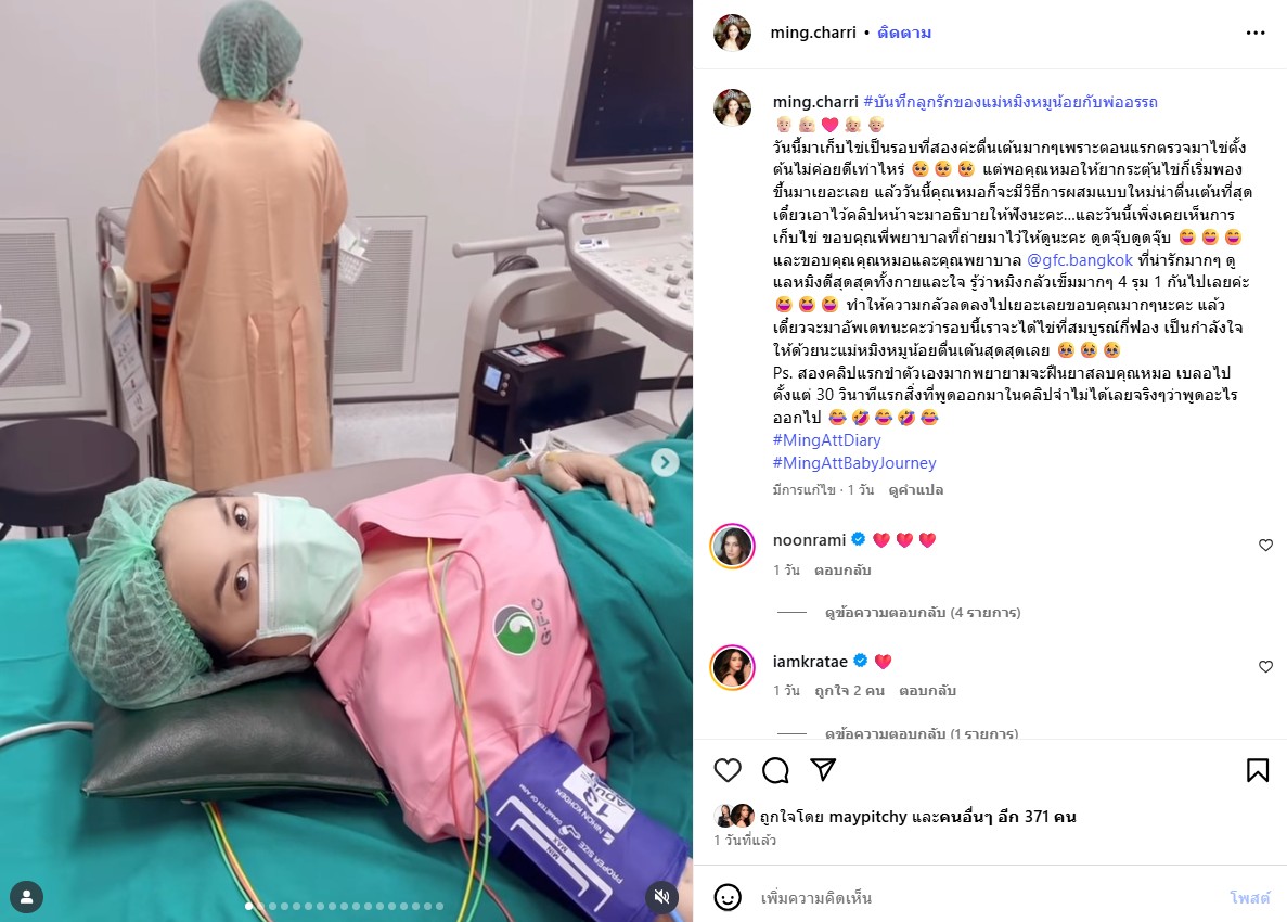 Ps. สองคลิปแรกขำตัวเองมากพยายามจะฝืนยาสลบคุณหมอ เบลอไปตั้งแต่ 30 วินาทีแรกสิ่งที่พูดออกมาในคลิปจำไม่ได้เลยจริงๆว่าพูดอะไรออกไป 😂🤣😂🤣😂 #MingAttDiary #MingAttBabyJourney ” ท่ามกลางคนบันเทิงและแฟนๆเข้ามาคอมเมนต์เป็นจำนวนมาก