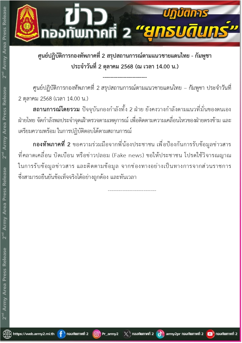 วันที่ 2 ต.ค.2568 ทางเพจกองทัพภาคที่ 2 ได้แถลงการณ์ สรุปสถานการณ์ โดยบระบุว่า ศูนย์ปฏิบัติการกองทัพภาคที่ 2 สรุปสถานการณ์ตามแนวชายแดนไทย-กัมพูชา ประจำวันที่ 2 ตุลาคม 2568 (เวลา 14.00 น.)