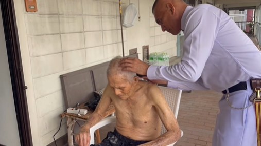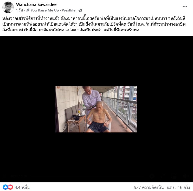 นั่นก็คือการไปตัดผมให้คุณพ่อ โดยระบุว่า “หลังจากเสร็จพิธีการที่ทำงานแล้ว ต้องมาหาคนนี้เลยครับ พ่อที่เป็นแรงบันดาลใจการมาเป็นทหาร จนถึงวันนี้เป็นทหารตามที่พ่ออยากให้เป็น